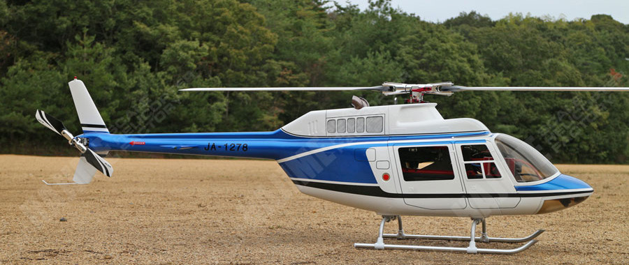 BELL222がランディングギヤ(引き込み脚)に対してジェットレンジャーはランディングスキッドで民間機のスケールヘリとしてBELL222共に人気です。